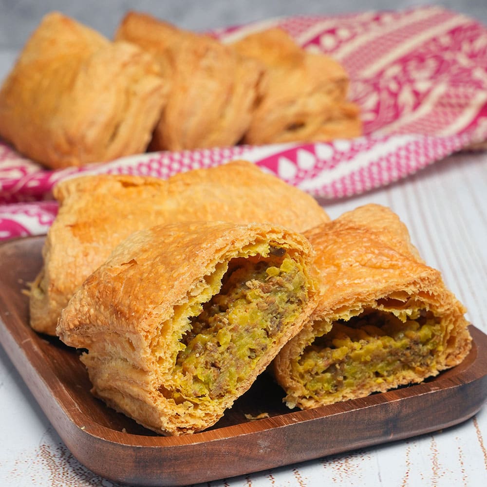 Un clásico de la pastelería salada. Hojaldre crujiente relleno de carne y arroz, sazonado al estilo casero para lograr un sabor auténtico. Una opción ideal para compartir en reuniones o como un snack completo y delicioso.