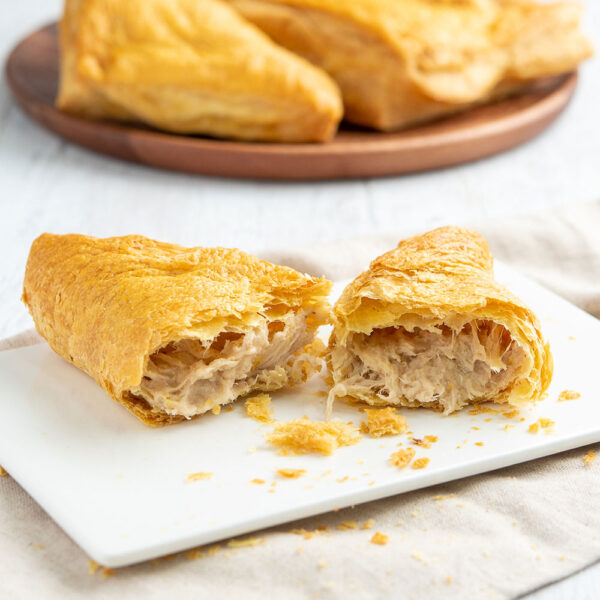 El hojaldre es nuestra especialidad, y este pastel es la mejor muestra. Capas doradas y crujientes que envuelven un relleno casero de pollo con crema de champiñones. Una combinación crocante y deliciosa, perfecta para cualquier hora del día.