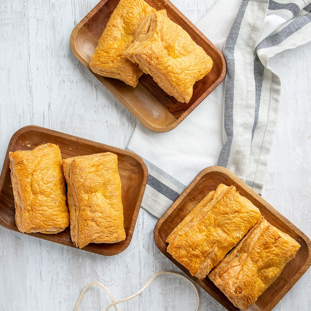 Un pastel diferente y sorprendente. Relleno de piña, jamón y queso, envuelto en hojaldre dorado y crujiente. La mezcla entre lo dulce y lo salado lo hace perfecto para disfrutar en cualquier ocasión.