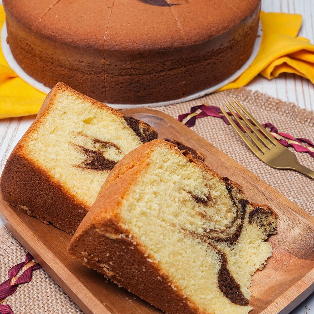 Un clásico que siempre encanta. Bizcocho esponjoso que combina la suavidad de la vainilla con vetas de chocolate. Disponible en dos presentaciones para que disfrutes en casa o en reuniones.